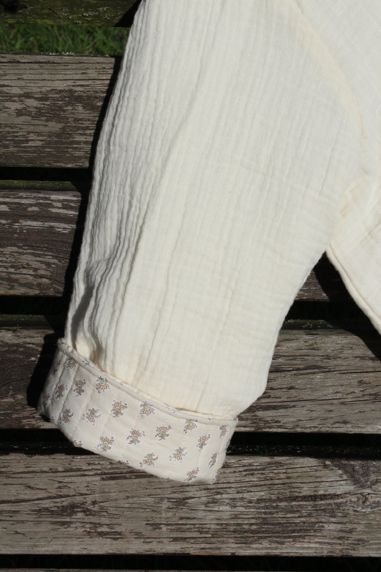 Composition : double gaze de coton beige, ouate, coton beige avec fleurs